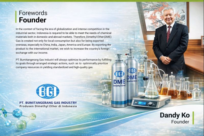 PT. Bumitangerang Gas Industry (PT BGI) adalah perusahaan nasional yang bergerak di bidang produksi dan distribusi Dimethyl Ether (DME) berkualitas tinggi untuk berbagai kebutuhan industri. Kami berkomitmen menyediakan solusi gas yang aman, efisien, dan ramah lingkungan guna mendukung perkembangan industri di Indonesia.